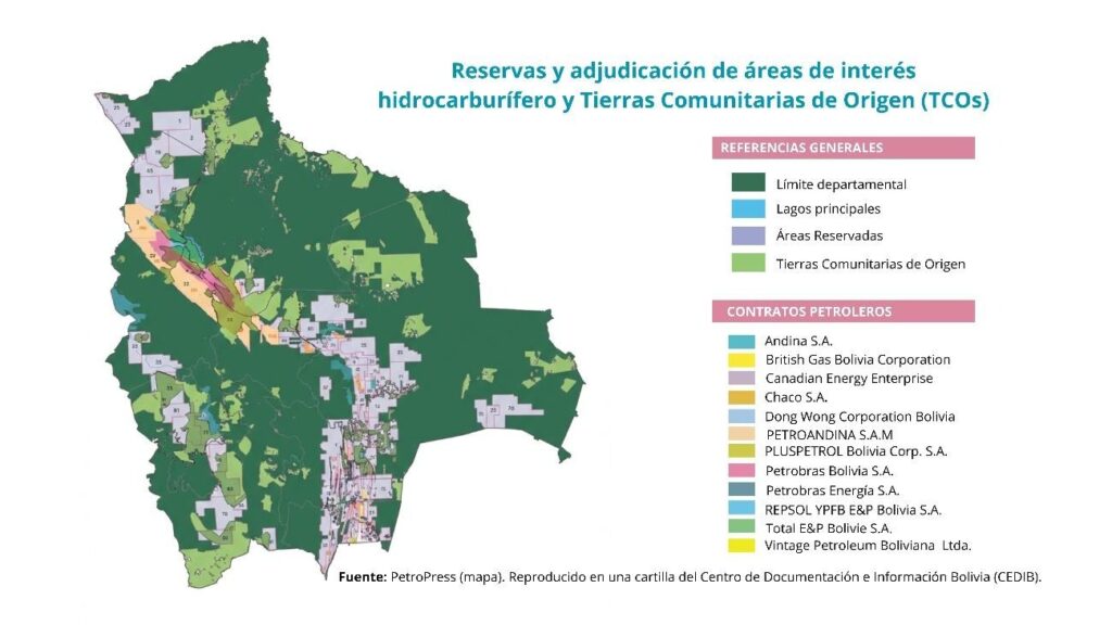 La mayoría de las reservas hidrocarburíferas identificadas hasta 2022 se concentran en zonas estratégicas de la Amazonía y del Chaco bolivianos, donde habitan pueblos indígenas. A este escenario se suman las explotaciones de oro en la Amazonía norte y la región chiquitana y, según análisis del Cejis basados en información pública de la Corporación Minera de Bolivia (Comibol) desde 2023, áreas con potencial de tierras raras y minerales tecnológicos en tierras bajas, que en muchos casos se superponen con territorios indígenas.